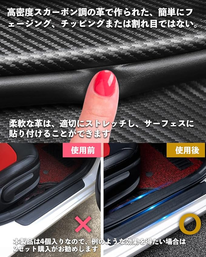 【高品質素材-カーボンファイバー】ドアシル装飾ストリップはカーボンファイバービニール製で、強力な接着剤を使用しています。ちぎっても車体に粘着性の残留物がなく、塗装面が損傷することはありません。