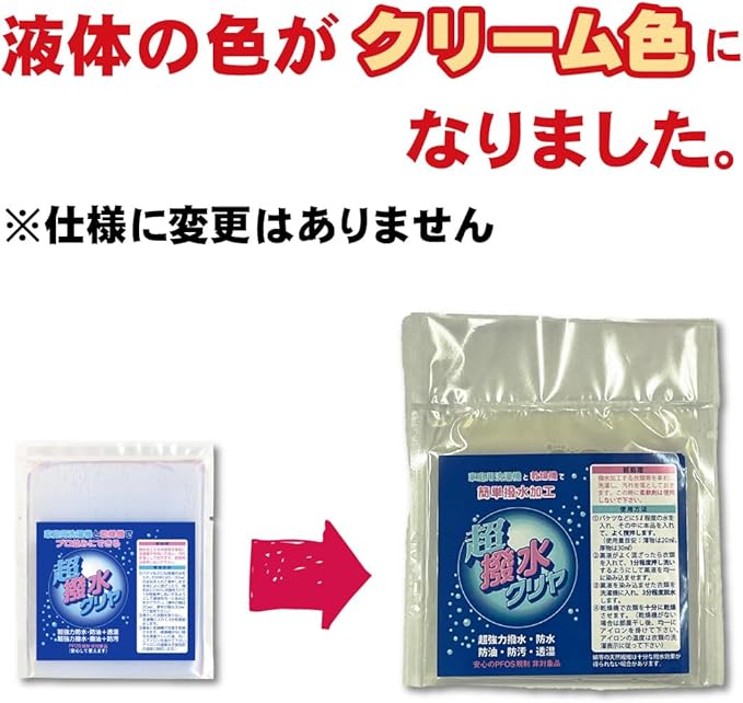 撥水・防水加工剤水玉が踊ります!!透湿性はそのまま!!お家の洗濯機と乾燥機でお手軽加工。撥水・防水・撥油・防油・防汚効果あり。 液の色合いが白からクリーム色に変更になりました。