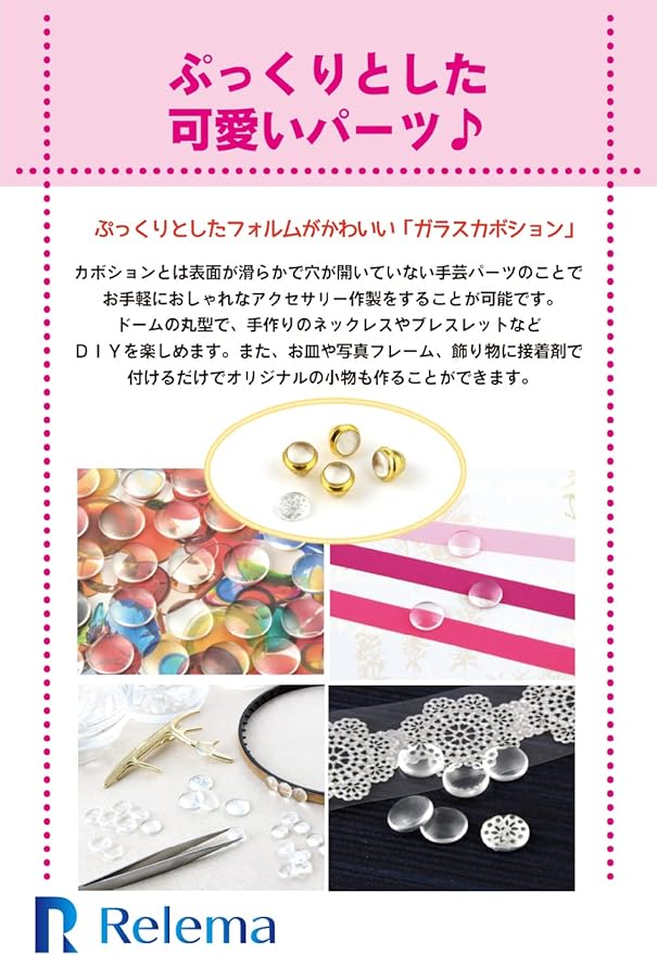 【 ぷっくりとした可愛いパーツ♪ 】 ぷっくりとしたフォルムがかわいい「ガラスカボション」をご存知でしょうか?カボションとは表面が滑らかで穴が開いていない手芸パーツのことで、お手軽におしゃれなアクセサリー作製をすることが可能です。ドームの丸型で、手作りのネックレスやブレスレットなどDIYを楽しめます。また、お皿や写真フレーム、飾り物に接着剤で付けるだけでオリジナルの小物も作ることができます。