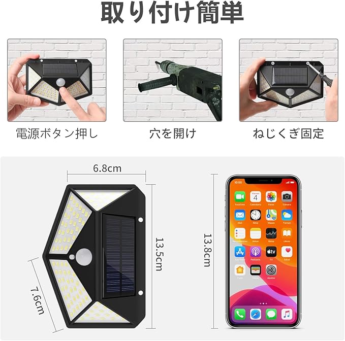【IP65防水・配線不要・設置簡単】コンパクトデザインで、どこでも取付け・収納が便利です。また、ソーラータイプ式なので、邪魔な配線・取付工事は不要、設置の自由度が非常に高い。設置場合により、両面テープ、ネジとバンド(別売り)3つ取付方法があり、手間かからず女性でも設置しやすいです。初期不良と認められた場合は商品を交換致します。