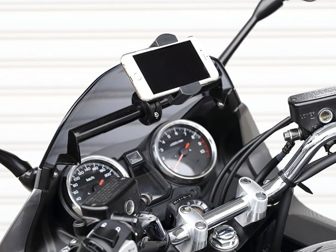 視点を変えずにデバイスやスマホでナビなど画面を確認出来る位置にマウントステーを設置。
