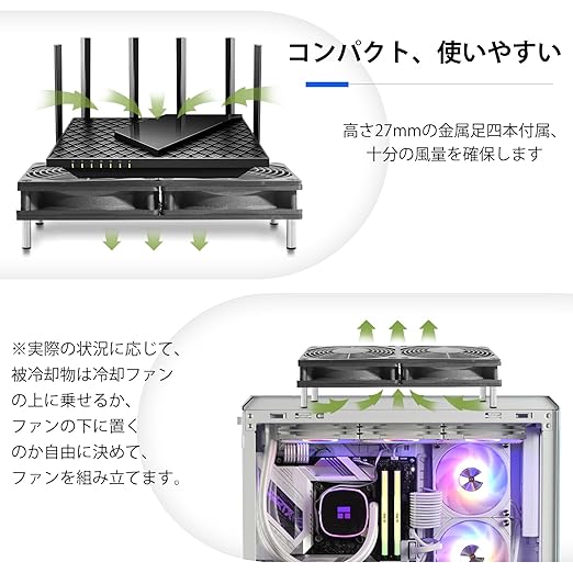 電子端末をUSB 冷却ファンに乗せて、風が下部(上部)から端末に当てるように冷却させます。空気の流れ又は熱気の排出を加速し、熱こもり現象を防ぐことができます。
