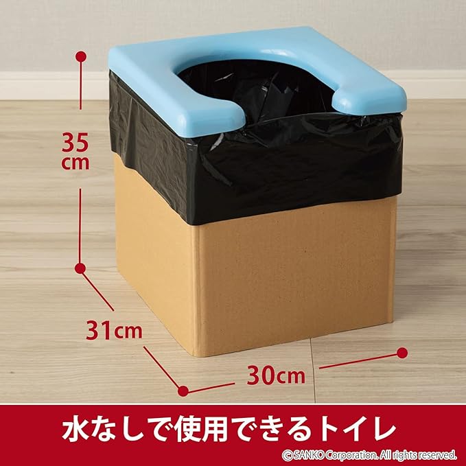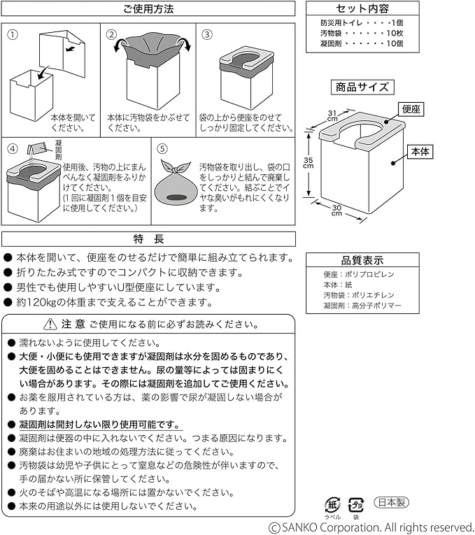 材質:便座/ポリプロピレン、本体/紙、汚物袋/ポリエチレン、凝固剤/高分子ポリマー