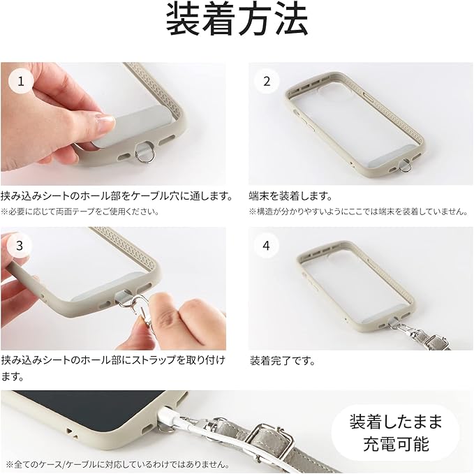 付属の挟み込みシートで、ケースにストラップホールが無くても装着可能