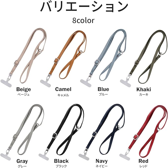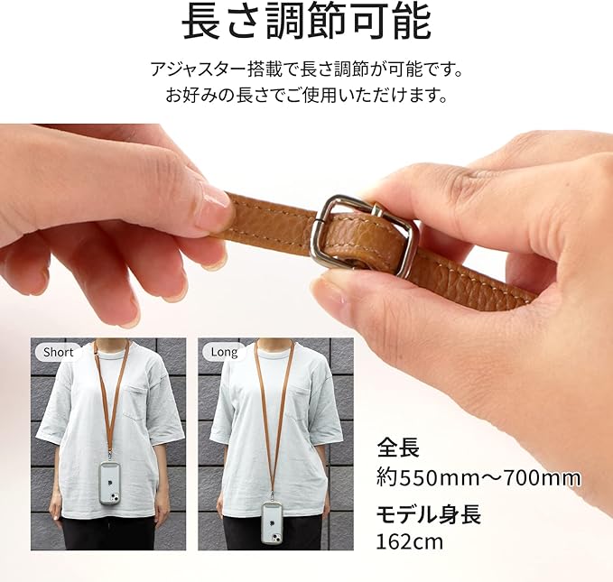 端末やケースを選ばず装着できる多機能ショルダーストラップ/付属の挟み込みシートで、ケースにストラップホールが無くても装着可能/首に負担をかけにくい平紐を採用/どんなコーデにも合わせやすいPUレザータイプ/長さ調整で首掛けor肩掛けが可能な2WAY仕様