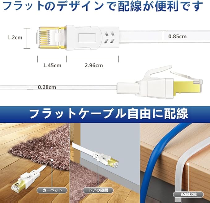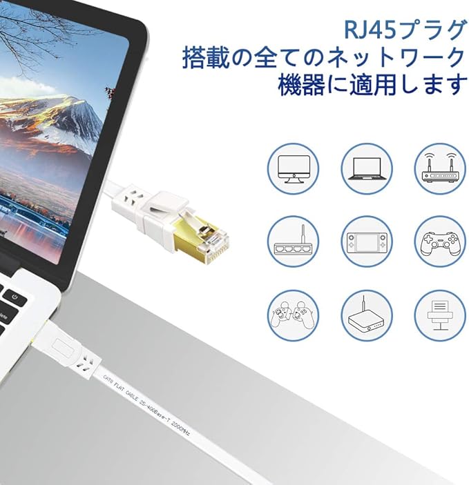 CAT8 LANケーブル カテゴリー8 ウルトラフラットケーブル 40Gbps/2000MHz ランケーブル やわらか FTPシールド イーサネットケーブル サーバー 企業様向け 業務用 屋外用 CAT8準拠 (1m-ホワイト)
