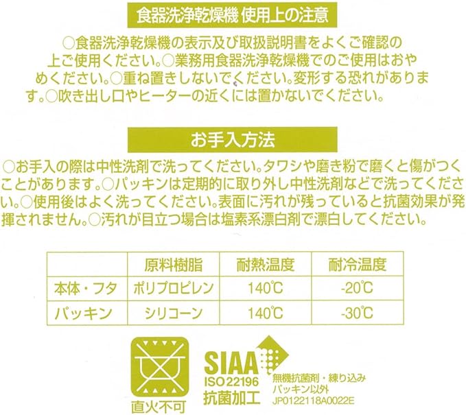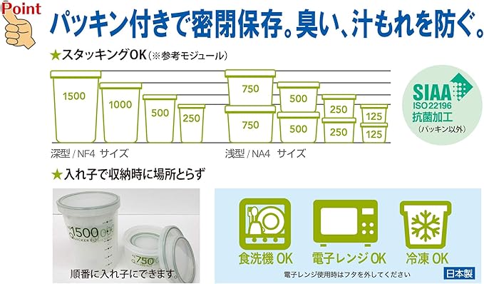 サイズ:NA750=直径13 高さ8.5cm、NA500=直径11 高さ7.5cm、NA250=直径9.5 高さ6cm、NA125=直径7.5 高さ5cm、容量:750ml 1、500ml 1、250ml 1、125ml 1、材質:本体、フタ=ポリプロピレン、パッキン=シリコンゴム、電子レンジの使用:可(フタを外して)、食洗機の使用:可、生産国:日本