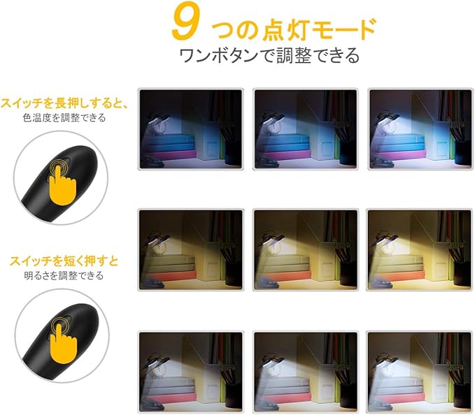 ✅14LEDの読書灯は2種類の光があり、別々に点灯することも、同時に点灯することも可能です。9つのモードがあり、冷たい白色光(読書)、日の白色(仕事)、暖かい白色(休憩)を選択して発光させることができます。