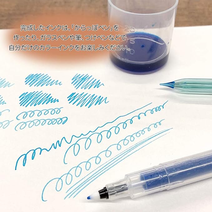 【セット内容】カラーインク5色(約25ml入) 各1本、調色用カップ(20ml用) 1個、からっぽペン 2本、マドラー 2本、インク空容器(容量25ml) 2本、説明書(インクレシピ)