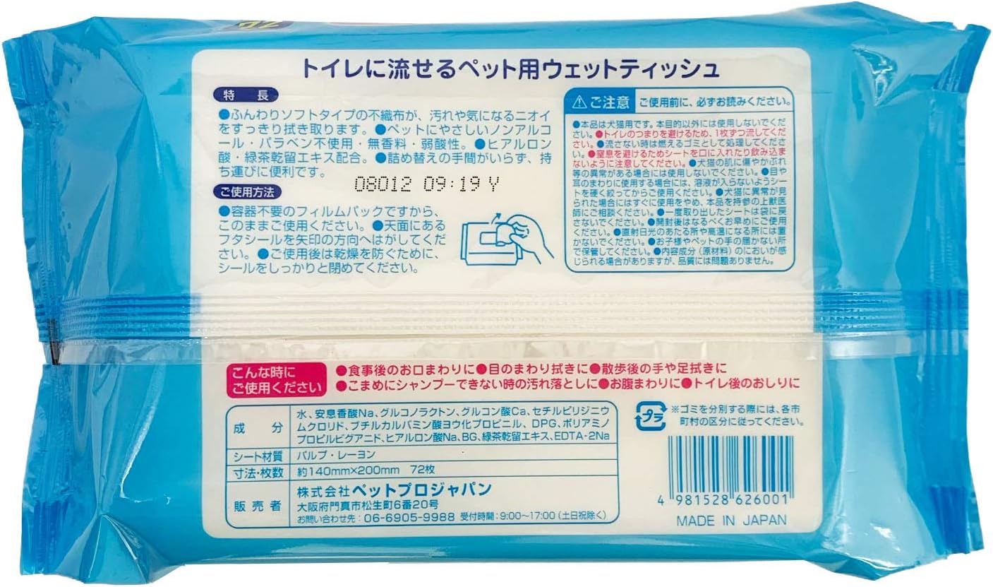 ペットプロ トイレに流せるウェットティシュ 72枚入 6個