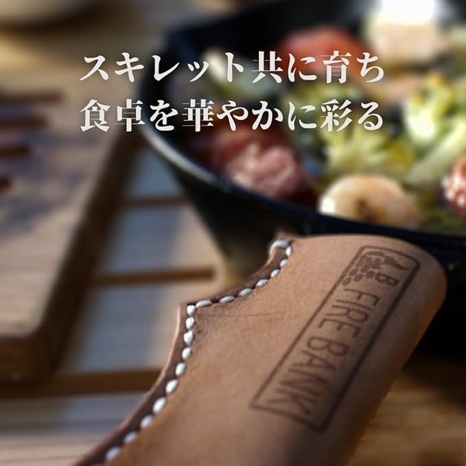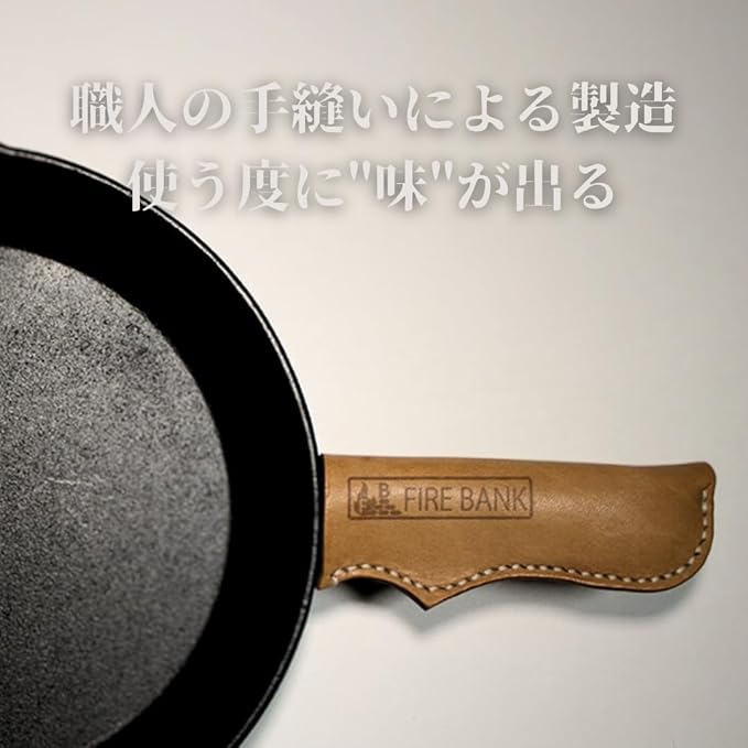 【特徴】スキレットの黒に映えるキャメル色、見た目と実用性を兼ね備えている本革、長くお使いいただくために太い糸を用いて手縫いで製造