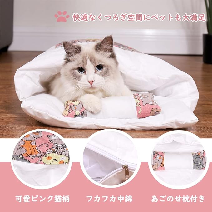 猫ベッド 猫用寝袋 犬 猫 ペットベッド 冬用 寒さ対策 保温防寒 猫布団 ペットマット クッションキャットハウス 猫寝床 ペット用品 ベッド型 ねこ いぬ 布団 ふわふわ 暖かい 枕付き (ピンク猫柄, 55*40CM)