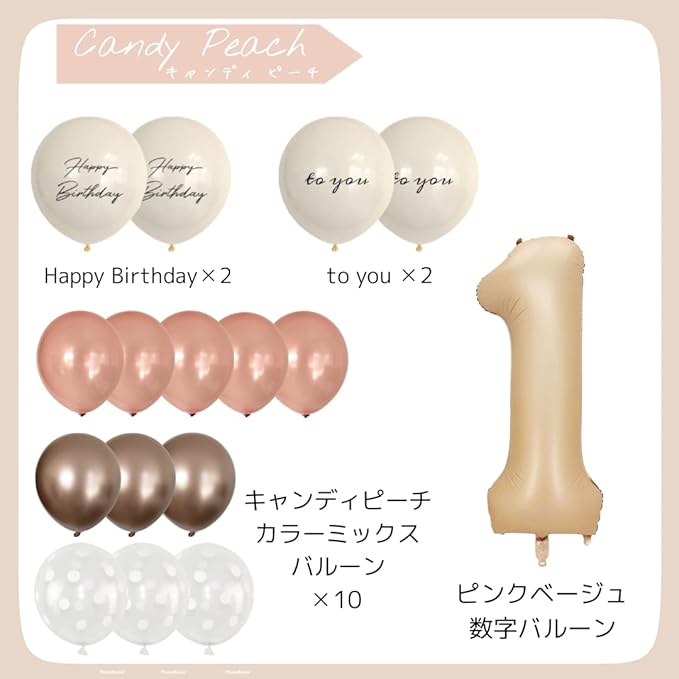 【選べる数字】大きなナンバーバルーン 1~9の数字からお選び頂けます。 サンドベージュの落ち着いたカラーでお部屋などの雰囲気にもぴったり 表面はマット加工されているので写真撮影時に撮影者が映り込みしないのもポイント♪ 【選べるカラー】HAPPYBIRTHDAYのおしゃれな筆記体の印字バルーン付き 当店限定オリジナルデザインの筆記体バルーンは写真映え◎ お好みのお色が選べます 【満足なボリューム感】大きな数字バルーンに加え、14枚のボリューム満点のゴム風船のセットです。 【品質へのこだわり】 ひとつひとつの風船を日本国内にて検品しております。 天然ゴムを使用しているので小さなお子様にも安心してお使いいただけます ※風船は性質上膨らませての検品ができない商品となっております。そのため3-5%の不良品が含まれる場合がございますが、予備の風船をお付けしていますのでそちらをご利用下さい。