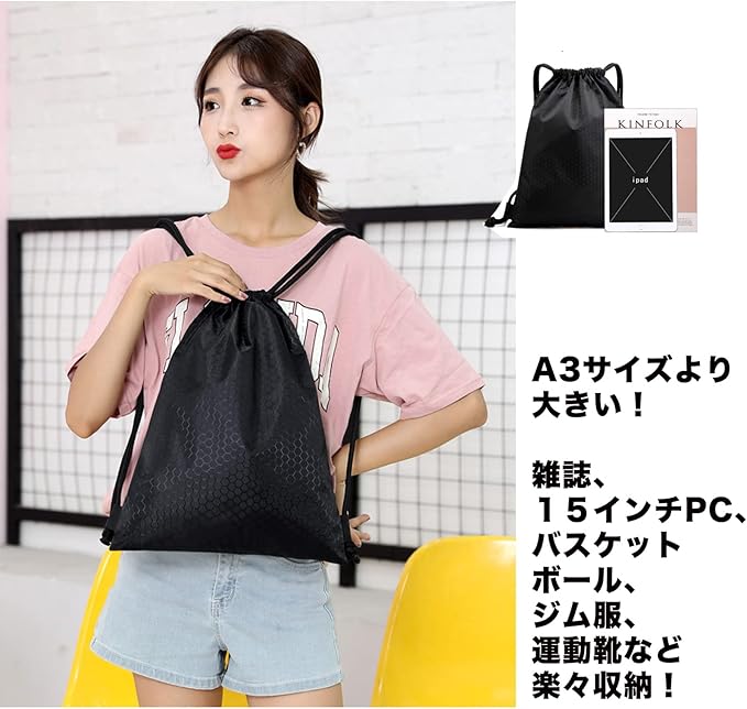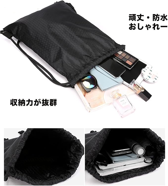 ジムサック スポーツバッグ ナップサック リュックサック 防水バッグ ケース 巾着 シューズ収納 軽量 水泳 部活 サークル 運動 旅行 キャンプ 小物防水袋1枚つき ブラック