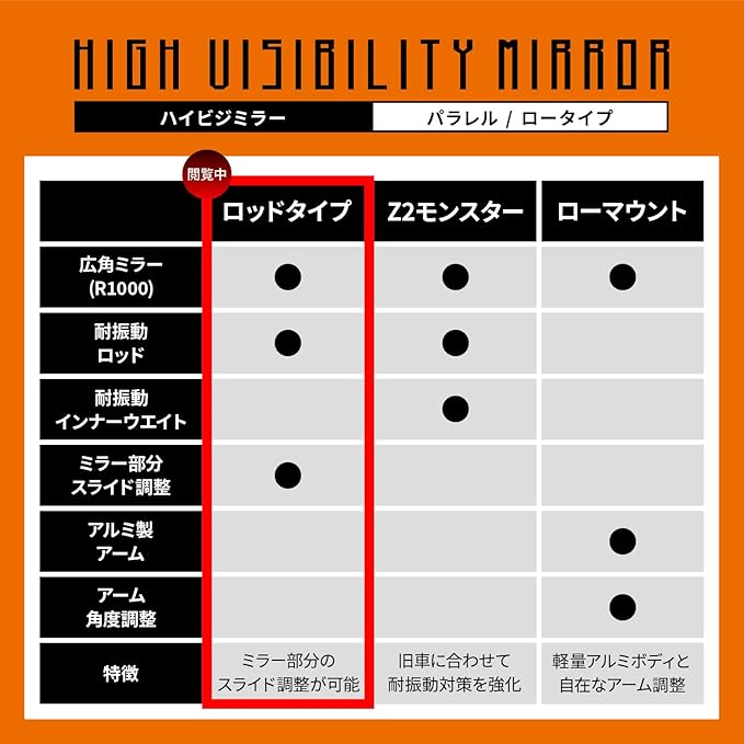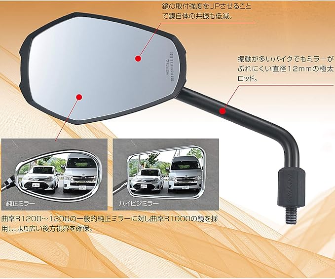 【仕様1】直径12mmの極太ロッドを採用し、鏡の取付強度を高くすることで、振動の多いバイクでもミラーがぶれにくい仕様になっています