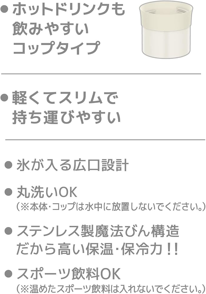 軽くてスリムで持ち運びやすい、おでかけにも便利なコップタイプのステンレスボトル。