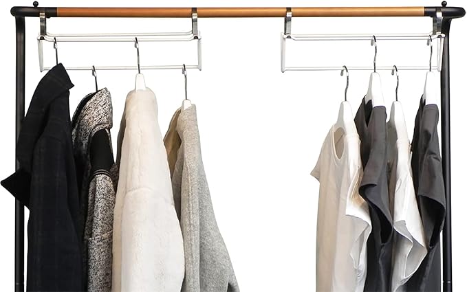 ●V字に構成された本体バーに洋服を段違いにして掛けることで、収納力を最大約1.5倍向上させます