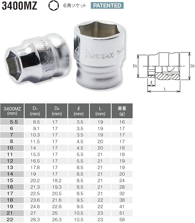 山下工業研究所 コーケン Z-EAL 3/8(9.5mm)SQ. 6角ソケット 22mm 3400MZ-22